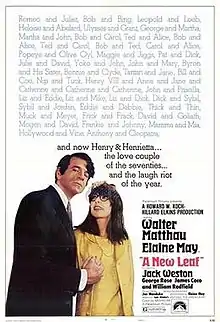 A New Leaf is a 1971 American black comedy film written and directed by Elaine May in her directorial debut based on the short story "The Green Heart" by Jack Ritchie. It stars May, Walter Matthau, Jack Weston, George Rose, James Coco, and Doris Roberts.[1] Prior to the film, May was better known for her collaboration as a stage comedian with The Graduate director Mike Nichols.