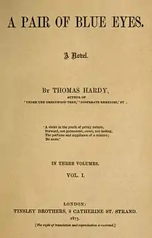 A Pair of Blue Eyes is a novel by Thomas Hardy, published in 1873, first serialised between September 1872 and July 1873. It was Hardy's third published novel, and the first not published anonymously upon its first publication. Hardy included it with his "romances and fantasies".
