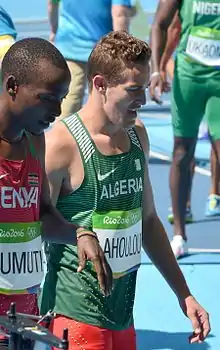 Abdelmalik Lahoulou (born 7 May 1992) is an Algerian athlete specializing in the 400 metres hurdles. He won the gold at the 2015 African Games, 2015 Military World Games, 2019 African Games and the silver at the 2015 Summer Universiade, 2022 African Championships in Athletics and more. His personal best in the event is 48.47 seconds set at the 2018 African Championships in Athletics. This was the current national record before he improved it to 48.39 at the 2019 World Athletics Championships in Doha.[2]