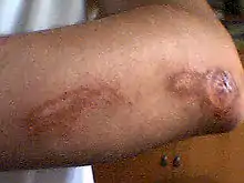 An abrasion is a partial thickness wound caused by damage to the skin and can be superficial involving only the epidermis to deep, involving the deep dermis. Abrasions usually involve minimal bleeding.[1] Mild abrasions, also known as grazes or scrapes, do not scar or bleed because the dermis is left intact, but deep abrasions that disrupt the normal dermal structures may lead to the formation of scar tissue. A more traumatic abrasion that removes all layers of skin is called an avulsion.