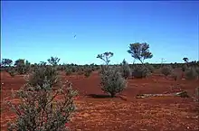Mulga scrub is distinctive and widespread, with the Mulga Lands of eastern Australia defined as a specific bioregion. The dominant species in these woodlands is mulga, with poplar box (Eucalyptus populnea) forming an increasingly important codominant in the eastern districts.[6][7] The extent of ground cover in mulga woodlands varies with canopy density of the overstorey, becoming almost nonexistent in extremely dense stands. In more open stands, the herbaceous layer consists of wire grasses (Aristida spp.)mulga is long-lived, mulga oats (Monocather sp.), mulga mitchell (Thyridolepis sp.), wanderrie (Eriachne spp.), finger grasses (Digitaria spp.) and love grasses (Eragrostis spp.). Various other woody species are also significant in mulga woodlands, particularly hop bushes (Dodonaea spp.), Eremophila and cassia (Senna spp.).[5][7]