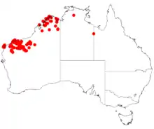 It is native to an area of the Kimberley and Pilbara regions of Western Australia.[2] A. arida has a scattered, wide distribution within the Pilbara but generally does not dominate the vegetation. It can form dense stands on many hilltops, called sky islands, particularly in the Hamersley Range. Grows in skeletal sandy soils along shallow, ephemeral watercourses or on slopes of hills and in breakaways[1] it will also grow in red sandy loam or coarse, gravelly, skeletal sandy soils over laterite or sandstone.[4] Often a part of spinifex[1] or low, open Eucalypt woodland communities.[4]