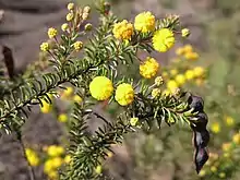 The shrub typically grows to a height of 0.4 to 2 m (1 ft 4 in to 6 ft 7 in) with terete hairy branchlets. Like most species of Acacia it has phyllodes rather than true leaves. The thick, terete, evergreen phyllodes are crowded on the stems and inclined to patent, they have a linear-oblanceolate shape and are shallowly to moderately recurved and have sparse to dense spreading hairs. The phyllodes can be slightly scabrous and have a length of 8 to 12 mm (0.31 to 0.47 in) and a width of 0.6 to 1.5 mm (0.024 to 0.059 in). It blooms between January and February and produces simple inflorescences that occur singly in the axils and are supported by slender, hairy peduncles. The large spherical flower-heads contain 25 to 50 densely packed bright yellow to golden flowers. After flowering glabrous and coriaceous seed pod form. The dark brown oblong shaped pods have a length of 35 to 50 mm (1.4 to 2.0 in) and a width of 8 to 12 mm (0.31 to 0.47 in). The seeds within are arranged transversely and are around 4 mm (0.16 in) in length with a short arillate funicle.[3]