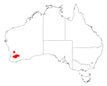 It is native to an area in the Wheatbelt region of Western Australia where it is commonly situated on plains growing in gravelly sandy loam and sandy soils often around laterite.[1] The range of the plant extends from around Bendering and Ardath in the north down to around Cuballing and Harrismith in the south as a part of low scrub and heathland communities.[2]
