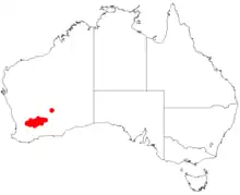It is native to an area in the Wheatbelt and Goldfields-Esperance regions of Western Australia where it is commonly situated on sandplains growing in sandy lateritic soils.[2] The range of the shrub extends from around Kellerberrin in the west to around Hyden in the south and Yellowdine in the east and is commonly found in disturbed areas like road verges and will regenerate after bushfires, it is usually a part of tall shrubland communities.[3]