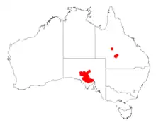 It is endemic to southern parts of central South Australia from the northern parts of the Eyre Peninsula in the south to around areas to the west of the Gawler Range and to just north of Tarcoola where it is usually situated on rocky hillsides and ridges that are composed of granite as a part of open and tall shrubland or low woodland communities.[1] It is often associated with other species of Acacia including Acacia aneura, Acacia cibaria and Acacia papyrocarpa growing in shallow compact loamy soils and alkaline red duplex and brown calcareous soils in areas where the average rainfall is 200 to 350 mm (7.9 to 13.8 in) per annum.[2]