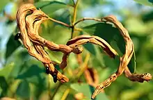 Indigenous Australians used the trunk of young trees to fashion spears and boomerangs. The green seed pods were cooked over coals and the seeds then eaten. Fully ripened black seeds were ground into flour mixed with water and consumed as a paste or cooked and eaten as a damper.[1] Other traditional uses include making string from the bark and using the gum exudate as a food source.[4]