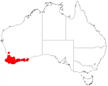 It is native to an area in the South West, Goldfields-Esperance and Great Southern regions of Western Australia where it is commonly situated on hills, rises and ridges growing in sandy, loamy or clay loam soils that can contain lateritic gravel.[1]