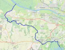 Beginning at the north of the Lac de Grand-Lieu, the Acheneau is joined from the south by the Tenu at Saint-Léger-les-Vignes. After passing through Port-Saint-Père, it passes Cheix-en-Retz and the confluence of the Blanche, also from the south, then reaches the outskirts of Rouans, from which it takes the 4 km route of the Buzay canal which, after crossing the Martinière canal, joins the Loire at the end of a 29.8 km route.[1] Before the construction of the Buzay canal, the current “Vue étier” formed its natural course between Vue (source) and Rouans (confluence).[2][3]