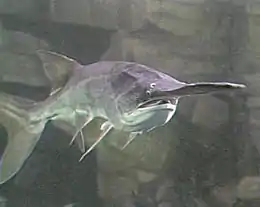 Acipenseriformes /æsɪˈpɛnsərɪfɔːrmz/ is an order of basal[1] ray-finned fishes that includes living and fossil sturgeons and paddlefishes (Acipenseroidei), as well as the extinct families Chondrosteidae and Peipiaosteidae.[2][3][4] They are the second earliest diverging group of living ray-finned fish after the bichirs. Despite being early diverging, they are highly derived, having only weakly ossified skeletons that are mostly made of cartilage, and in modern representatives highly modified skulls.[5]