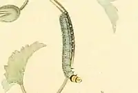 The larvae feed on Asarina procumbens under a silken spinning, which is attached to one or more leaves. The larva is long and tube-like and dark green to almost black in the final instar. The head is red. Larvae can be found from March to the end of May. Pupation takes place at the base of the host plant.[2]