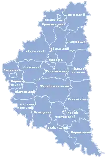 Before 2020, Ternopil Oblast was subdivided into 21 regions: 17 districts (raions) and 4 city municipalities (mis'krada or misto), officially known as territories governed by city councils.[3]