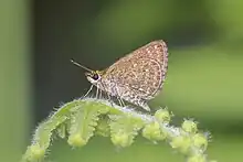 Upperside dark brown; cilia whitish marked with brown at the end of the nervules. Forewing with a discal curved series of about six pale dots. Hindwing unmarked. Underside dark brown, the costa and the apex of the forewing and the entire hindwing greenish-ochreous, Forewing with the discal series of spots as above, and an indistinct marginal lunular series. Hindwing with a very irregular discal series of spots and an obscure marginal series.