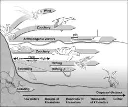 Dispersal is a vital component of an organism's life-history,[167] and the potential for dispersal determines the distribution, abundance, and thus, the community dynamics of species at different sites.[168][169][170] A new habitat must first be reached before filters such as organismal abilities and adaptations, the quality of a habitat, and the established biological community determine the colonization efficiency of a species.[171] While larger animals can cover distances on their own and actively seek suitable habitats, small (<2 mm) organisms are often passively dispersed,[171] resulting in their more ubiquitous occurrence.[172] While active dispersal accounts for rather predictable distribution patterns, passive dispersal leads to a more randomized immigration of organisms.[168] Mechanisms for passive dispersal are the transport on (epizoochory) or in (endozoochory) larger animals (e.g., flying insects, birds, or mammals) and the erosion by wind.[171][84]