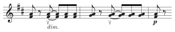 Theme F is a complex motif primarily consisting of triplet sixteenth notes in G major, alluding to a "swarm of drunken wasps". Theme F also serves to prepare the assertive theme G.[8]