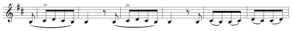 Theme D is distinguished by its dance-like melody, the melismas of the oboe's high A, and the rhythmic ostinato on weak beats in the low register. These four themes give rise to a quasi-closed rondo structure (ABACDA) in the first part of the music.[12]