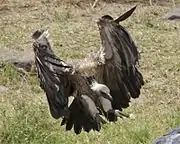 Bushmeat is meat harvested from non-domesticated animals including mammals, amphibians, reptiles, and birds. Poachers target vulture species in sub-Saharan Africa for bushmeat harvest and consumption.[2][5] Poaching and harvest of vultures for market trade usually involves poisoning the birds by baiting livestock and wildlife carcasses with agrochemicals. This attracts the vultures to feed, as they are obligate scavengers. The birds eat the poisoned meat and die, making the harvest easy. However, the poisons the vultures ingest are passed along through the food chain which places the humans that consume these birds also at risk for poisoning. The two leading causes for vulture deaths are poisoning and trade in traditional medicine, these two causes make up 90% of reported deaths.[2]
