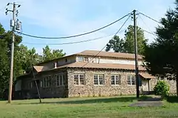 Aggie Hall is a historic former gymnasium in Bruno, Arkansas, a short way south of Arkansas Highway 235. It is a single-story stone structure, topped by a hip roof which has a clerestory section (also hip-roofed) at its center. The clerestory is finished in weatherboard; both roof lines have Craftsman-style exposed rafter ends. The building was erected in 1926 by the student members of the Lincoln Aggie Club, believed to be the first chapter established (in 1921) of the Future Farmers of America, and was originally intended as a gymnasium for the adjacent Bruno Agricultural School and as a location for the club's activities.[2]