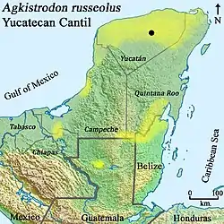 Agkistrodon russeolus occurs on the Yucatán Peninsula. The type locality is "11.7 km north of Pisté, Yucatán, Mexico."[5]:328 p. The majority of records are from the semi-arid northern regions of the peninsula in the state of Yucatán, Mexico. However, several additional records are scattered in the south at various isolated localities in the Mexican states of Campeche, Tabasco, the vicinity of the Quintana Roo and Belize border, and northern Guatemala.[3]:60 p.[6]:61 p.[7]:399 p.[8] A number of reptiles from the Yucatán Peninsula fit this pattern of distribution, with continuous and unbroken records in the north, and several isolated and disjunct populations in the south.[9]:32-33 p.