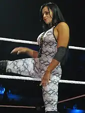 Aksana made her in-ring debut at an FCW live event on January 15, 2010, when she teamed with AJ Lee, Savannah, and Eve Torres to defeat Serena Mancini, Naomi Knight, Courtney Taylor, and Liviana.[14] She began appearing on "The Abraham Washington Show", Abraham Washington's in-ring talk show segment, where she acted as his sidekick.[15] She continued to wrestle as well, appearing in several multi-Diva tag team matches.[14] When it was announced that there would be a creation of the FCW Divas Championship, Aksana competed in a tournament to determine the inaugural champion, but was defeated in the first round by Serena.[14] In August, she began hosting "The Aksana Show", a spin-off of "The Abraham Washington Show", with guests including Mason Ryan, FCW Florida Tag Team Champions Johnny Curtis and Derrick Bateman, and FCW Divas Champion Naomi Knight.[15] On August 31, 2010, it was announced that Raudonienė would be part of the all-female third season of NXT, retaining the ring name Aksana, and with Goldust as her storyline mentor.[16] On the September 21 episode of NXT, Aksana began a storyline where she was having problems with her visa and was facing deportation from the United States.[17] On the October 5 episode of NXT, Aksana won a challenge for the first time by winning the mechanical bull riding contest.[18] The following week, Goldust proposed to Aksana in the storyline so that she could remain in the United States, which she accepted.[19]