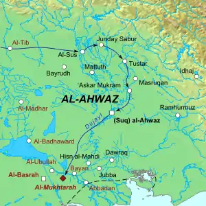 Due to their proximity to Basra, some of the border districts of al-Ahwaz were entered by the Zanj in the initial months of the revolt. The rebels' movements in the province at this stage, however, were restricted to the lands around the southern Dujayl River (the modern Karun). The Zanj secured peace agreements with some of the villages in the area; other settlements, however, resisted the rebels and were attacked as a result.[8][9]