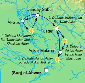 With Muhammad now on his side, 'Ali decided to send an expedition under his brother al-Khalil to al-Sus, where Ahmad ibn Laythawayh, who had been appointed by Masrur al-Balkhi as the military governor of al-Ahwaz, was staying. Al-Khalil and Muhammad joined forces and headed toward the city, but Ibn Laythawayh intercepted them before they arrived and launched an attack. Many of the rebels were killed or captured, and the rest soon withdrew. Ibn Laythawayh then proceeded to Junday Sabur and established himself there.[50][51][52]