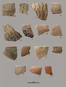 The pottery found in association with the Mesolithic findings contained a wide variety of decorations: incised wavy line, dotted wavy line, "lunula-shaped", alternately pivoting stamp, rocker stamp drops, rocker stamp drops deep, rocker stamp dotted zigzag, rocker stamp plain zigzag[9]