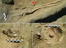 Within the excavations 43 Meroitic graves were identified, these were deep graves which interrupted other burial phases and features. Among these 43 graves 3 distinct types were determined; the most common being a rectangular shaft that was dug east–west. The second most common was very similar to the prior, however it also contained a circular chamber on the west side.[2] The final was one additional irregular/circular shaft burial on the southern side, it was the only one found but the fireplace C-14 dates attributes it to the same time period. The bodies found were oriented west with their faces turned north, traces of botanical remains were found above and below indicating mats surrounding them.[2] There was no true pattern in spatial distribution of age, sex or gender except for a concentration of infant and children burials in the northeastern sector and an increase in burial goods within rounded graves. The grave goods found included 12 ceramic pots which were handmade and sand and straw tempered, these were buried with anklets, necklaces and other ornaments along with one iron arrowhead under the skull of a 10-year-old child.[2] The adults were found with the larger vessels, however, two small feeding cups were found with infant burials. The investigations into the bodies found indicated that there was low dental caries, showing a low carbohydrate diet or plants which inhibit dental caries, there was also a high calculus rate which points to a protein diet. The studies also found indication of stress during childhood and evidence of healed injuries.[2]
