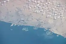 Aerial view of Dubai. Al Muntazah is located approximately halfway between the clearly visible Palm Jumeirah (left) and Palm Jebel Ali (right), just inland from Sheikh Zayed Road