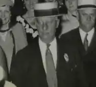 Knowing that the race had been lost, Smith immediately signaled for his entourage to begin packing their bags to leave Chicago. Moses and others snuck out a side door of the hotel, while Smith found himself cornered by reporters at the front entrance to the hotel. The reporters, which had incidentally been gathered in anticipation of Roosevelt's arrival at the hotel, asked Smith whether he intended to support the party's nominee. Smith gave them no answer.[1] Smith was reportedly so angered that he left Chicago without congratulating Roosevelt.[20] However, his silence was partially due to an agreement between Smith, Raskob and John W. Davis to convene with each other in New York before declaring their attitudes about the Democratic ticket.[21]