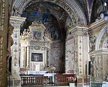 The most important landmark of Alanno is the Renaissance church of Santa Maria delle Grazie, built around 1485, it was said that the Madonna appeared to a shepherd and asked him to organize the building of a church on that position overlooking the valley. The church was built 3 kilometres (2 mi) outside the town. It has an elegant portal (1505) surmounted by a lunette with a fresco of the Deposition. The single nave ends with an apse with frescoes attributed to Andrea De Litio's workshop (1522) and a 15th-century triptych with Madonna, Angels and Saints. The decoration of the interior is otherwise in Baroque style. The altar, finished in 1642, has a precious 15th century triptych with the Madonna between St. Sebastian and a Holy Pope.