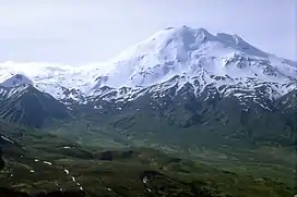 The refuge contains the Chiginagak and Veniaminof volcanoes, the latter of which is one of Alaska’s active volcanoes, and last erupted in 1995.[2] The crater which is approximately 5.2 miles (8.4 km) in diameter contains a 25-square-mile (65 km2) ice field, making it the most extensive crater glacier in North America.[2] In 1967, Mount Veniaminof was designated as a National Natural Landmark. The Upper Sandy River has its source at Mount Veniaminof and flows down to form a delta above Sandy Lake.