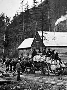 The Alaska Interior was largely roadless up until about the 1870s, with only a network of trails established by the native people of Alaska, which Russian, and later American, traders and prospectors used as well. The Russians in Alaska stuck to coastal regions,[2] and built almost no new trails or roads during their time of possession (1741 to 1867), and early mining, such as near Sitka was close to the coast.[3] In the 1870s and 1880s, spurred by increased settlement and prospecting, some settlers began making arrangements with the natives, improving trails and in some cases imposing tolls, such as on the Dalton Trail.[4]