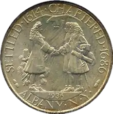 Numismatic author Q. David Bowers wrote that the design "has always been considered pleasing by numismatists".[28] David Bullowa, in his 1938 work on commemoratives, wrote, "every symbol and device on this issue has significance as connected with the early Colonial history of New York. The inscriptions have been reduced to a size that makes them almost unreadable. The word 'Liberty' on this coin, above the eagle, is microscopic."[29] Art historian Cornelius Vermeule, in his volume on American coins and medals, deemed the Albany half dollar "an important contribution to American numismatics".[30] He suggested that the beaver, a symbol of Albany, gnawing the maple branch, a symbol of New York State, "would then seem to become an allegory of municipal government feeding on the rule of the state!"[30] Given the complexity of the reverse, he stated, "that the coin as a whole has considerable appeal can be counted as a credit to the good training and innate taste of the artist, who was able to work in all these allusions to local aspirations and a bygone event with modest, positive precision."[30]