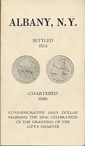 The Albany Charter half dollar, also known as the Albany-Dongan half dollar or Albany half dollar, is a commemorative half dollar struck by the United States Bureau of the Mint in 1936. It was designed by sculptor Gertrude K. Lathrop, who lived in Albany, New York's state capital.