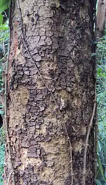 Albizia chinensis is a deciduous or evergreen tree that reaches a height of up to 30–43 m. Its trunk has a diameter up to 1–2 m. Its flowers are stalked heads that aggregate into a yellow panicle. The fruits are indehiscent pods.[2]