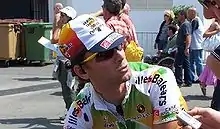 Valverde joined the UCI ProTeam Illes Balears–Caisse d'Epargne in 2005.[12] He won the last stage in Paris–Nice and finished second overall behind Bobby Julich. He also took two stages in the Tour of the Basque Country. In his first ever appearance at the Tour de France, he won the 10th stage of the Tour de France ahead of Lance Armstrong, whom he beat in the sprint into Courchevel at the end of a mountain stage in the Alps.[13] After Stage 12, he was in 5th place on GC, 3 minutes and 16 seconds behind Armstrong. He was also leading in the young rider classification (white jersey), with a 3-minute and 9 second lead on Armstrong's teammate Yaroslav Popovych.[14] However, Valverde was forced to withdraw from the Tour during the 13th stage because of a knee injury. Valverde recovered barely in time for the UCI Road World Championships in Madrid, Spain. The injury of Óscar Freire, who was the Spanish team captain, forced him to become the team leader, despite having had only one day of competition before the Worlds. Amazingly, he was able to be competitive and finished second to winner Tom Boonen.[15]