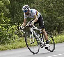 He went one better the following Sunday, winning the sprint of a small group of riders to impose himself on Liège–Bastogne–Liège. It was the third time in his career Valverde had won La Doyenne.[51] It was also the second time that he had won Liège–Bastogne–Liège and La Flèche Wallonne in the same year, becoming only the second rider to have achieved this double twice, after Ferdinand Kübler.[52] In June, he won the Spanish National Road Race Championships.[53] At the Tour de France, Valverde finished on the podium in 3rd place, his first podium finish at the Tour; achieving a lifelong dream of a top 3 finish. With that finish he had one career goal left, a World Championship victory.[54][55]