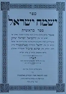 • Yismach Yisroel - The fundamental text of Aleksander ideology. Written by Yerachmiel Dancyger, including many of the teachings of the first Rebbe R' Yechiel. Completed after his death by his brother Shmuel Zvi. (Lodz, 1911)