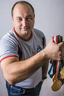 Aleksei Aleksandrovich Petrov (Russian: Алексей Александрович Петров; born 8 September 1974) is a retired Russian weightlifter. He had his peak performance in 1994, when he won the European and world titles and set four world records: one in the snatch, two in the clean and jerk, and one in the total. In 1996, he won gold in the 91 kg (201 lb) class at the 1996 Olympics and set his second world record in the snatch. At the 2000 Olympics he finished third in the 94 kg (207 lb) class. His last international success was a European gold achieved in 2002.[1][2] The Russian Olympic Committee selected younger competitors in favor of Petrov for the 2004 Olympics, partly because of his injuries, excessive weight, and a failed drug test. Meanwhile, his season best was 10 kg (22 lb) higher than the gold medal result at those Olympics.[3][4][5]