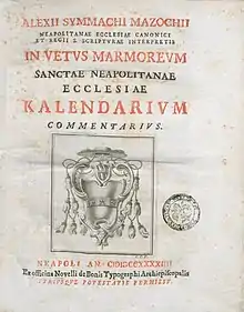 Alessio Simmaco Mazzocchi was born in 1684 at Santa Maria, near Capua.[1] He attended the Seminaries of Capua and Naples.[2] He was ordained a priest in 1709, and became professor of Greek and Hebrew at the archiepiscopal seminary at Naples.[1] In 1711 he was made a canon of the Cathedral of Capua and in 1735 he was appointed professor of theology and Sacred Scripture at the University of Naples.[3] He died in Naples on 12 September 1771.[2] His funerary monument was sculpted by Giuseppe Sanmartino.[4] Mazzocchi was a friend of Francesco Scipione Maffei, Jacopo Facciolati and Ludovico Antonio Muratori.[2] He was a member of several learned societies, including the Accademia Ercolanese and the Académie des Inscriptions et Belles-Lettres.[2] Mazzocchi made significant contributions to the field of biblical criticism (Spicilegium Biblicum, 3 vols., 1763).[3]