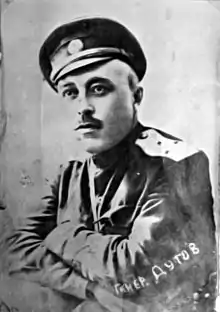 Alexander Ilyich Dutov (Russian: Алекса́ндр Ильи́ч Ду́тов; 17 August [O.S. 5] 1879 – 7 February 1921) was a Russian Cossack ataman and lieutenant general who led the Orenburg Cossacks in a revolt against the Bolsheviks.[1][2]