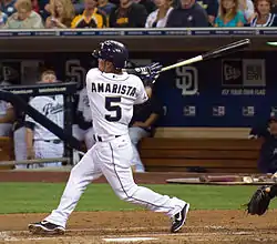On May 3, 2012, Amarista and minor league pitcher Donn Roach were traded to the San Diego Padres for reliever Ernesto Frieri.[5] After 11 games with the Triple-A Tucson Padres, Amarista was called up to the Padres on May 17 to play second base.[6] Amarista was eventually supplanted by Logan Forsythe as the regular second baseman, but he continued to show his versatility by making occasional starts at second, shortstop, left field, and also in center field when Cameron Maybin was nursing a wrist injury. On June 28, 2012, Amarista hit his first career home-run, a grand slam off of Brett Myers, to cap off a six-run ninth inning in a victory against the Houston Astros.[7] This began a brief power surge where Amarista hit 4 home runs and collected 11 RBI in five games.[8] Amarista finished 2012 batting .240, with a .282 on-base percentage and five home runs in 275 at-bats.