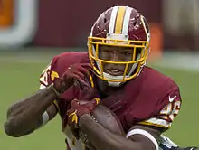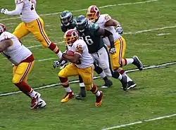 Morris remained the starter for the Redskins, splitting carries with rookie Matt Jones and Chris Thompson.[87] The Redskins' rushing scheme in their offense was noticeably poor causing Morris's statistics to be particularly lower compared to his past seasons.[88] On September 13, 2015, Morris ran for a season-high 121 yards on 25 carries against the Miami Dolphins.[89] During the game, Morris was tackled by Ndamukong Suh after a nine-yard gain, and as Suh got up it appeared that he kicked Morris's helmet off, causing major controversy in Suh's first game as a Dolphin.[90] On November 15, 2015, Morris ran for 92 yards on 15 carries against the New Orleans Saints.[91] On November 29, 2015, Morris ran for 78 yards on 23 carries against the New York Giants.[92] On December 13, 2015, Morris scored his first and only touchdown of the season against the Chicago Bears.[93] On January 3, 2016, Morris ran for 100 yards on 19 carries against the Dallas Cowboys.[94] On January 10, 2016, Morris ran for 50 yards on 11 carries in the NFC Wild Card Round loss to the Green Bay Packers.[95]