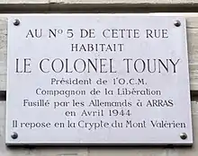 Touny's body was found and identified in January 1945, and returned to Paris on 11 November 1945, where he was chosen to represent the men of the Resistance who had been killed by the enemy, among 15 French heroes taken solemnly to the Dôme des Invalides in Paris, then to the Arc de Triomphe, before being buried at Fort Mont-Valérien.[1] His body is now entombed in the crypt of the Mémorial de la France combattante at Mont-Valérien.[5]