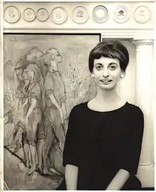 ![]() Alice Wadowski-Bak at an art show with her painting, 6 Blind People on a Tight Rope, in the background | |