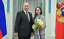 Zagitova was awarded the Order of Friendship by Vladimir Putin for her Olympic win at the 2018 Winter Olympics.[45] She is also a two-time winner of the Silver Doe Prize, awarded by the Federation of Sports Journalists of Russia, as one of the ten best athletes of 2017 and 2018.[46][47] She was named female "Athlete of the Year" in the nomination "Pride of Russia" by the Ministry of Sport of Russia in 2018, leaving behind fencer Inna Deriglazova and gymnast Angelina Melnikova.[48] Forbes Russia's Top 30 Under 30 list named Zagitova as the top athlete in the sports category.[49] Zagitova is also part of the list of Top 40 most successful Russians from sport and show business under the age of 40.[50] She was named "Sportswoman of the Year" at the 2019 Glamour Russia Awards[51] and "People's Sportsman" (as determined by VTsIOM) at the Sovetsky Sport – Year-in-review ceremony of the same year.[52] Zagitova opted out of the 2020 Russian Test Skates, stating she was wanting to focus on her new role as the host of a Russian reality TV show, Ice Age.[53]