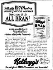 With the rising popularity of patent medicine in advertising, The Kellogg Company of Canada published a book named A New Way of Living that would show readers "how to achieve a new way of living; how to preserve vitality; how to maintain enthusiasm and energy; how to get the most out of life because of a physical ability to enjoy it." It touted the All-Bran cereal as the secret to leading "normal" lives free of constipation.[2][3]