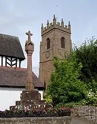 Associated with the church are three structures that are listed at Grade II. At the entrance to the churchyard is a 14th-century cross standing on a plinth with three steps. It was formerly sited in the roadway before it was moved to the churchyard.[11] The lychgate dates probably from the 19th century. It is constructed in brick with a tiled roof and sham timber framing with plastered ends to the gables.[12] The walls at the east side of the churchyard and the gate piers, with their pyramidal caps, probably date from the 18th century.[13] In the churchyard is a yew tree said to be 2,500 years old.[5] There is also the war grave of an airman of World War II. [14]
