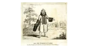 "All the World's in Paris" is an 1814 comedy song by the British performer Joseph Grimaldi.[1] It formed part of the Harlequin Whittington Boxing Day pantomime first performed at the Theatre Royal, Covent Garden in London. Sometimes also known as "All the Word's at Paris" it mocked the fashionable British upper-class tourists who had flocked to the French capital Paris following the defeat of Napoleon.[2] Grimaldi dressed up as an exaggerated dandy of the Regency style as well as traditional clown make-up.[3]